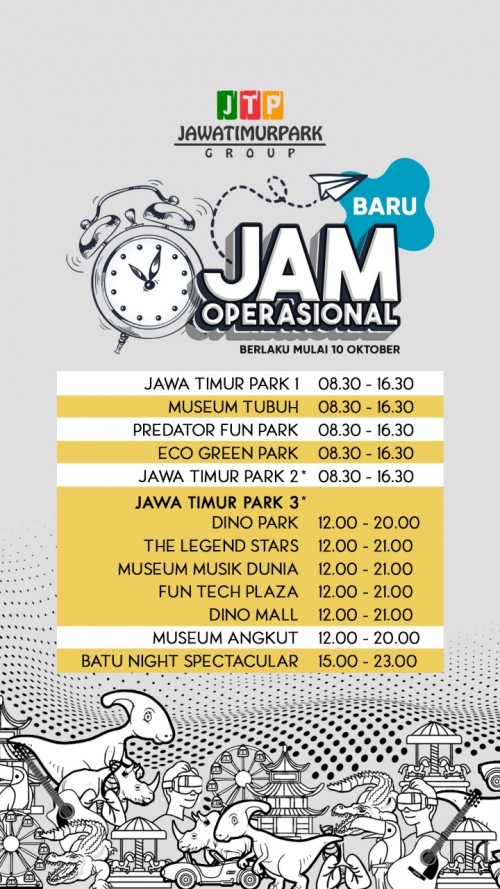 Jam operasional dimulai sejak 08.30 dan tutup 16.30 WIB berlaku di Jawa TImur Park 1, Museum Tubuh, Predator Fun Park, Eco Green Park, Jawa Timur Park 2 (Museum Tubuh dan Batu Secret Zoo).